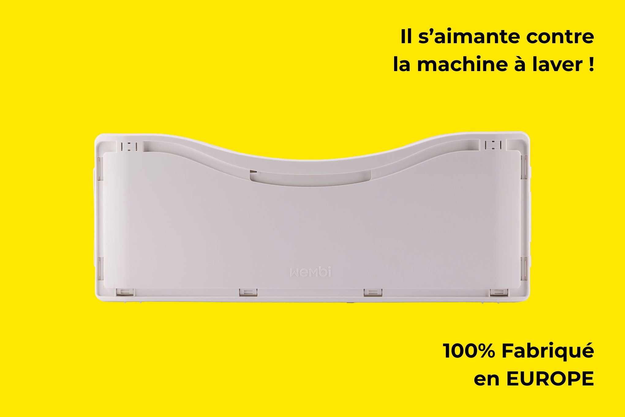 Wembi repose sur le sol et grâce à ses puissants aimants se fixe sur le bas de la machine à laver, sans glisser ni vibrer.